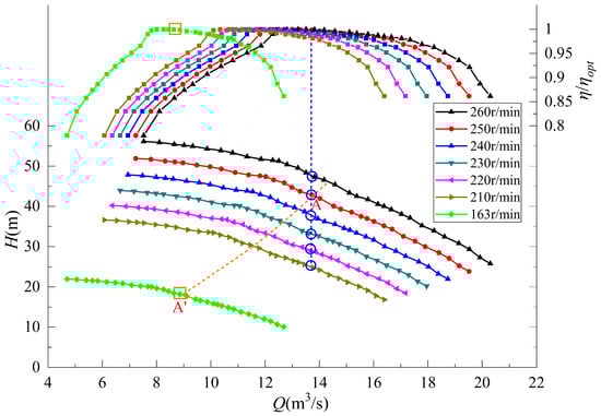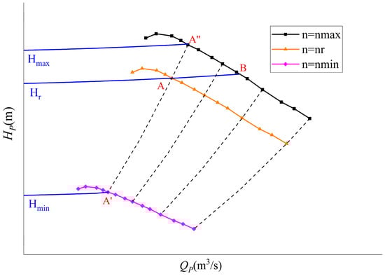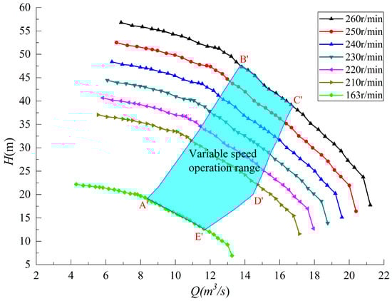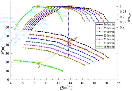 The energy characteristic curve obtained from the model test at the rated speed is converted into the prototype energy characteristic curve by the similarity rule. Figure 23 illustrates the variable speed characteristic curves of the prototype pump at different rotated speeds. In Figure 23, point A, point A′ and point A″ are the optimal operating points of the centrifugal pump under the design head, minimum head and maximum head conditions, respectively.
