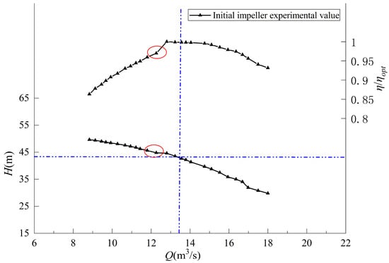 In Figure 2, the intersection point of the blue dashed lines is the design condition point of centrifugal pump. The hump margin of centrifugal pump is less than 2% at the location of red circles in the operating area of pump station. Analyzing the initial impeller based on the model test indicated that the cavitation performance and hump margin are difficult to meet the performance requirements. Therefore, the initial impeller, the impeller geometry, blade profile, exit edge, wrap angle, and inlet blade angle for the centrifugal pump to be developed were all improved to enhance cavitation performance and characteristics of hump instability. The targeted hydraulic design is determined by considering the operational features of the pump station and then combining the reasonable requirements for hydraulic performance between the minimum head and the maximum head. Firstly, during the impeller hydraulic design process, the small flow hump margin should be guaranteed to meet the requirements of the centrifugal pump running at low speed, thereby enhancing the water supply guarantee rate and ensuring the unit’s excellent hydraulic properties. Secondly, the cavitation characteristics are improved to ensure the safe and stable operation of the pump station within its operational range.