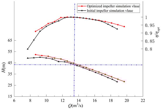 Rated speed characteristic comparison curve of initial impeller and optimized impeller prototype centrifugal pumps (CFD).