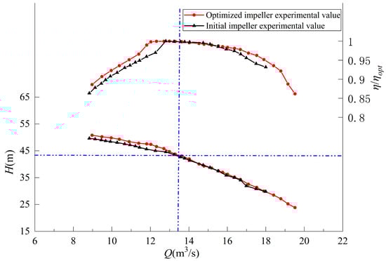 Rated speed characteristic comparison curve of initial impeller and optimized impeller prototype centrifugal pumps (Test).