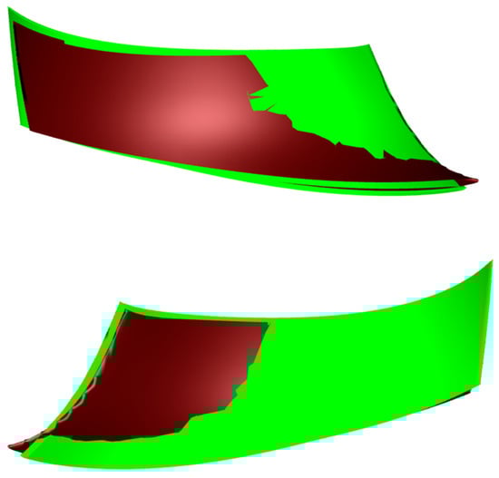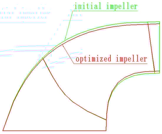 The main geometric parameters of the optimized impeller are shown in Table 3, and the comparison of model impeller meridian flow channel are shown in Figure 5. The comparison of model impeller blades are also shown Figure 6, where the green part is the initial impeller and the red part is the optimized impeller.