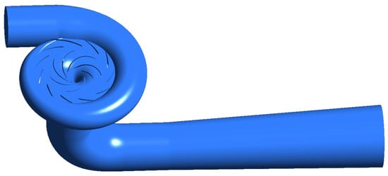Pre-processing is essential for numerical simulation, including solid modeling and mesh division. The overall calculation domain of centrifugal pumps is divided into three main parts: the volute and guide vane domain, the impeller domain, and the draft tube domain. The calculation domain model of centrifugal pumps is shown in Figure 7.