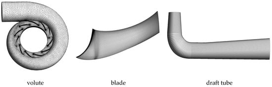 The computational grid for the three calculation domains were generated respectively, and the division of the regional mesh was refined to ensure precise representation. To improve the calculation speed and accuracy of iterative calculations in the simulation, a grid independence check was carried to determine the number of grids for final calculation. According to the numerical calculation results of centrifugal pump efficiency and head, when the grid number of grid elements exceeds 5.71 × 106, the head and hydraulic efficiency tends to be stable. The number of grid elements for volute and guide vanes domain, impeller domain, and draft tube domain were 2.2 million, 2.4 million, and 1.1 million, respectively. The grids for each part are shown in Figure 8.