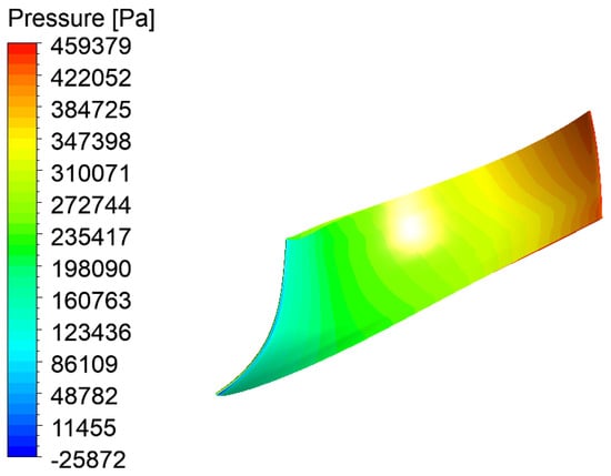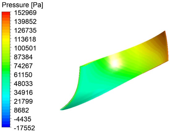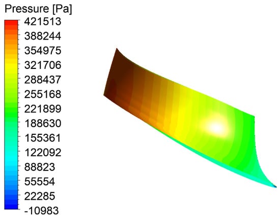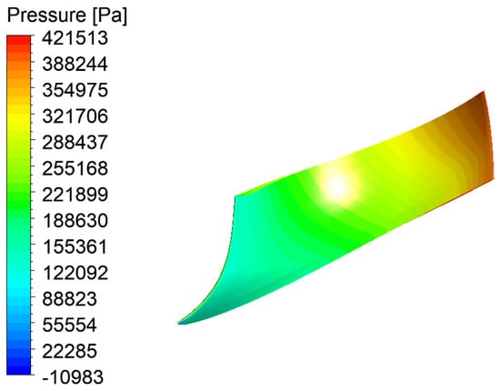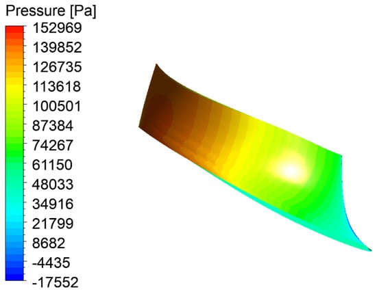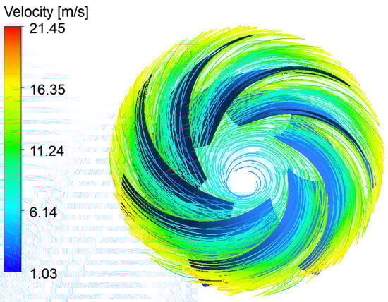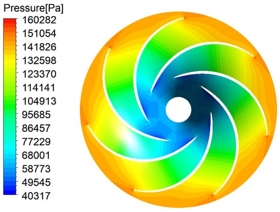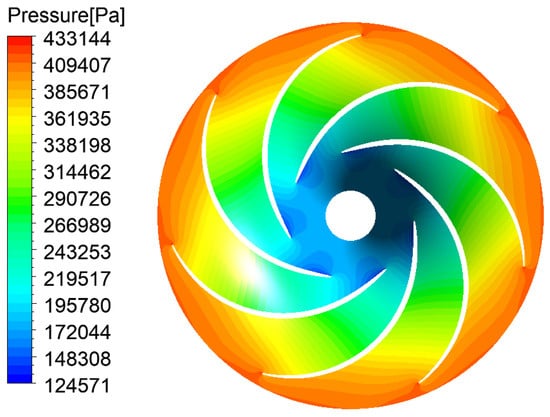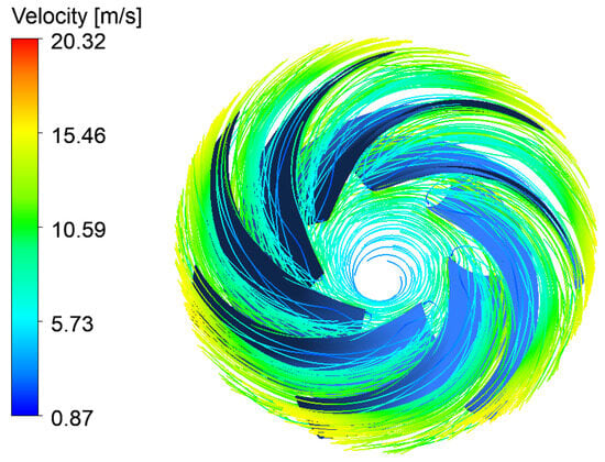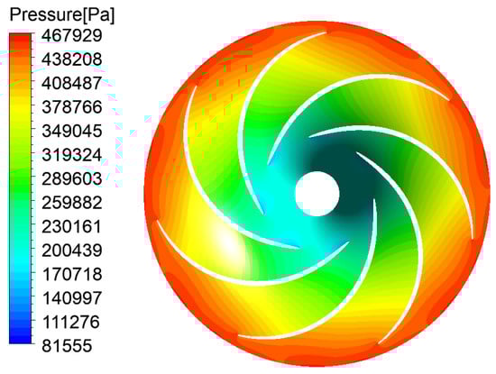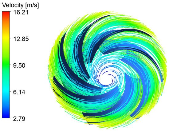 The impeller internal pressure distribution and streamline under maximum head conditions are depicted in Figure 10 and Figure 11. It can be observed that internal pressure within the impeller is uniform, with static pressure gradually increasing from the impeller’s inlet to outlet. Additionally, the internal streamline within the impeller is uniformly distributed, with fluid velocity gradually increasing.