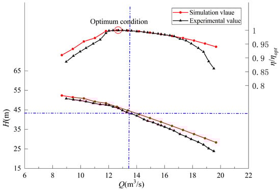 To facilitate comparison, the model head, flow, efficiency, and other parameters are transformed into prototype values using the similarity law. The numerical calculation and experimental values of the prototype energy characteristic parameters for the rated speed condition are contrasted in Figure 22. The horizontal axis represents the flow Q (m3/s), and the vertical axis represents the head H (m) and the relative efficiency of the centrifugal pump η/ηopt, respectively. The intersection point of the blue dashed lines is the design head and design flow and the red circle is the optimum operating condition point. The centrifugal pump has great operating efficiency at design conditions, as demonstrated by the red lines in Figure 22. It maintains this level of efficiency throughout a wide operating region (11 m3/s–17 m3/s) near the rated flow rate (η/ηopt > 0.975).