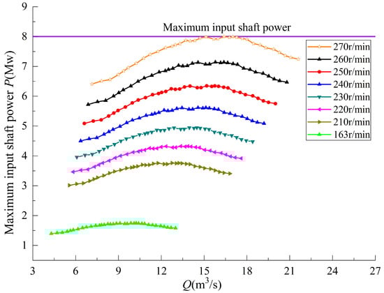From the flow, head, and efficiency parameters in Figure 23, the maximum input shaft power curve of the centrifugal pump at different rotational speeds can be calculated. Figure 24 illustrates the correlation between the rated speed and the maximum input shaft power at each operating condition. Considering the motor capacity of the pump station has been determined and the allowance is required, the maximum rotation speed of the centrifugal pump is determined to be 260 r/min.