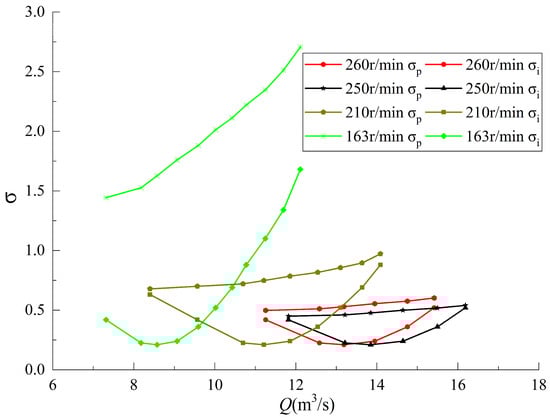 Pump incipient cavitation coefficient performance curve (Test), where σp denotes the plant cavitation coefficient and σi represents the incipient cavitation coefficient (IEC60193).