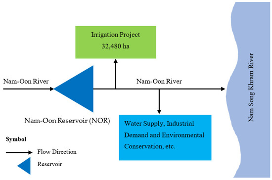 The research area is situated in Sakon Nakhon province, Thailand, as shown in Figure 1. The research was conducted between 2021 and 2022. The NOR has an irrigation area of 32,480 hectares and is located in the Songkham Basin in northeastern Thailand. The storage capacity of the reservoir is 520.000 million cubic meters (MCM), while the average annual inflow is 404.835 MCM. Data on the inflow were collected over a period of 28 years, from 1994 to 2021. Schematic diagrams of the NOR system, which provides domestic water supply, irrigation, industry demand, and conservation of the environment, are shown in Figure 2.