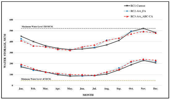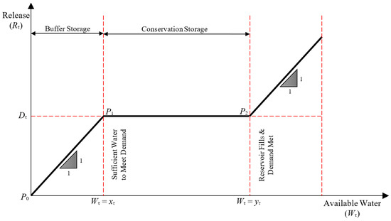 The reservoir system was simulated by applying the water balancing concept, which necessitated hydrologic data, physical reservoir data, water demand data from the reservoir, and other relevant data. The available water was computed using Equation (1) based on this concept. The estimation of the monthly water release considered the available water resources, the specified release requirements, the standard operating procedures, and the represented RORC displayed in Figure 3.