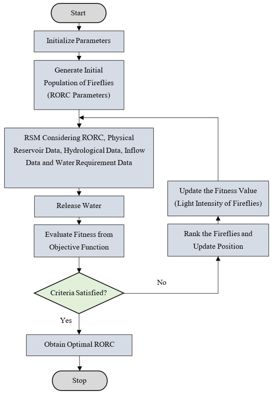 The FA and RSM are linked by first initializing the essential data, including the full capacity level, normal high-water level, dead storage level, and monthly water demands. Subsequently, a starting population of fireflies is generated by the model, where each firefly symbolizes the monthly RORC of the reservoirs, which defines the upper and lower RORCs. To find the optimal value for RORCs, there are 24 decision variables, namely, 12 for the upper RORCs and 12 for the lower RORCs, depending on the number of months in a year. The first set of fireflies in the initial population consisted of 24 decision variables, which were used in the RSM to obtain the monthly release of water based on those RORCs and the standard operating rules. The discharged water was employed to calculate the previously described objective functions. Subsequently, fitness evaluations and updates of the fitness values were performed for the objective function. Subsequently, the fireflies were assigned rankings, their locations were updated, and the stop criterion was checked. This process was iterated until the criteria were satisfied, achieving the most optimal RORC values. Figure 4 depicts the FA and RSM utilized for searching the RORCs.