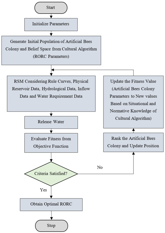 The ABC-CA and reservoir simulation model were linked, starting with initializing the essential data, including the full capacity level, normal high-water level, dead storage level, and monthly water demands. Next, the initial population of the ABC and belief space from CA were generated by the model, where each ABC denotes the monthly RORC of the reservoirs that define the upper and lower RORCs. To find the optimal value for the RORCs, there are 24 decision variables, namely, 12 for the upper RORCs and 12 for the lower RORCs, depending on the number of months in a year. The initial population of the ABC consisted of 24 decision variables, which were then used in the RSM to obtain the monthly release of water based on those RORCs and the standard operating rules. The discharged water was employed to calculate the previously described objective functions. Subsequently, fitness evaluations and updates of the fitness values were performed for the objective function. The ABC parameters were reassigned to new values using the situational and normative knowledge of CA. Subsequently, their ranking and position were revised, and the stopping criterion was evaluated. This process was iterated until the criteria were satisfied, achieving the most optimal RORC values. Figure 5 depicts the ABC-CA and RSM utilized for searching the RORCs.
