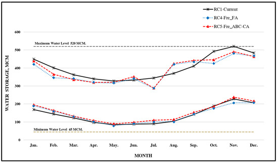 The FA model introduced in this research produced optimal RORCs, as depicted in Figure 6. The search process employed the objective of minimizing yearly excess water, considering historical and projected inflow data. The RORCs labeled RC2-Avr_FA and RC3-Avr_ABC-CA, and the existing ones (RC1-Current) displayed a similar trend. The lower RORCs derived from both historical and projected inflow data surpassed the current RORCs from March to July. However, the upper RORCs of the newly optimized rules exceeded the current ones from June to September. It is important to highlight that the obtained upper RORCs (RC3-Avr_ABC-CA) were below the current upper RORCs from October to November.