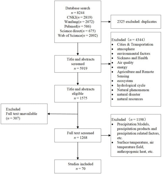 Following the removal of duplicate articles, the following criteria were used to screen the literature for this study: (1) based on the article titles and abstracts, the literature in subjects unrelated to describing meteorological elements was excluded; (2) the literature written by authors who were not able to access the original article was not included; (3) full text based on the topic of this study excludes the literature investigating the features of spatial and temporal changes in meteorological elements, correlates of meteorological elements, and spatial and temporal models in other domains; and (4) the literature on non-spatiotemporal sampling data was excluded based on data types, e.g., models using surface data or gridded data for spatiotemporal estimation. The process of the literature screening is shown in Figure 1.