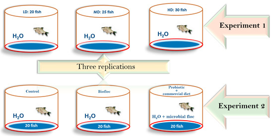 - Diet supplementation experiment (DS): Similarly, fish were subjected to three treatments with triplicates each (D1: control diet; D2: biofloc; and D3: probiotic + commercial diet). For each tank, 20 fish were used (Figure 2). A commercial diet was used as a control diet. In this experiment, a total of 180 fish were used.