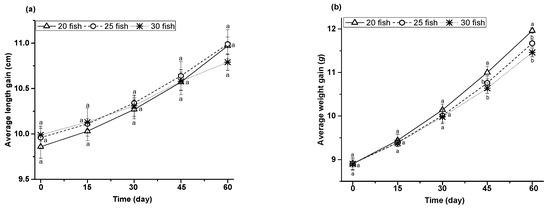 | SGR (% day−1) | 0.49 ± 0.05 a | 0.45 ± 0.03 ab | 0.42 ± 0.05 b |