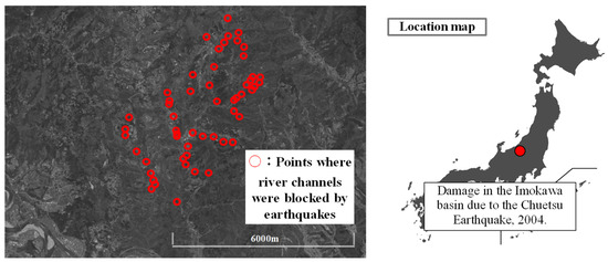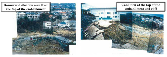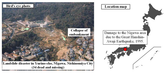 To date, many large-scale landslides and embankment collapses attributable to the effects of earthquakes have been reported [23,24,25]. A major disaster developed during the Hanshin-Awaji Earthquake [26]; residential embankments in the Nigawa Yurino area of Hyogo Prefecture, Japan, slid and blocked adjacent river channels (Figure 2 and Figure 3) [27,28,29]. There was no significant down-stream flooding because the flow of the blocked river in the Nigawa Yurino area was low and remedial measures such as sediment removal were rapidly implemented.