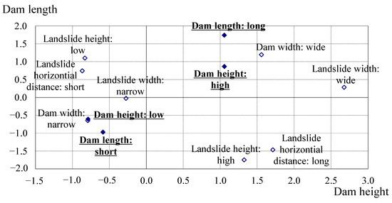 Generally, methods that predict the scale and deposition shape of a landslide dam include one or more physical models of mountain collapse and soil mass movement; both computational models [48,49] and statistical analyses have been used to analyze the relationships between historical deposition shapes and other factors. In our previous study [45], we used a statistical method to extract factors that correlated highly with the deposition height and length. The data (e.g., topographic conditions) were readily available; all were recorded during historical emergencies. We developed a predictive formula via the statistical processing of such factors. We first used the Quantification Theory Type III [56] of multivariate analysis to define trends in relationships by reference to historical landslide dams associated with earthquakes and heavy rain (61 disasters; 168 cases [44]). This theory quantifies the impacts of various factors on the several categories of dams and presents the findings in a graphical format. An example is shown in Figure 4. Correlations were apparent between the vertical axis (the dam length) and the horizontal axis (the dam height), and other factors are plotted on their individual axes. The results suggest that the various topographic conditions of mountain collapses (e.g., landslides and deep-seated collapses) influenced the deposition shapes of landslide dams.