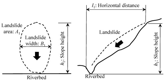 Next, to simply predict the deposition heights and lengths of landslide dams based on only limited information (the “factors”), historical data on landslide dam formation were subjected to statistical analysis [44,45]. Specifically, using variables such as the topographic conditions shown in Figure 5, an optimal predictive formula was derived via repeated reduction and multiple regression analyses. Additionally, Figure 4 is expressed in dimensionless terms [56]. The conceptual diagrams that reveal the mountain collapse shapes associated with landslide dam formation (river channel blockages) are shown in Figure 6, and those that show the deposition shapes of landslide dams are presented in Figure 7 [45].