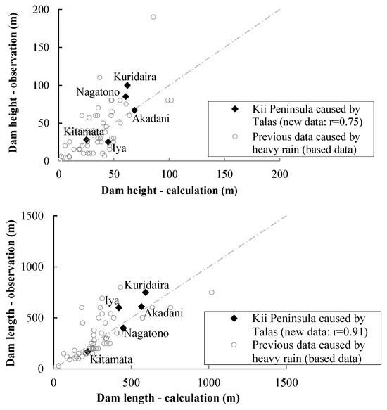 To verify the reproducibility of our predictive formula for heavy rain, we used new data on landslide dams that formed in the Kii Peninsula of Japan during Typhoon 12 in 2011 (Talas) [50]. Figure 8 compares the predicted deposition heights and lengths to the actual values [50]. Figure 8 also shows the predictions for the historical landslide dams caused by heavy rain [44] that were used in the original analysis [45]; the predicted and actual values were well-correlated (correlation coefficients r: 0.75 and 0.91, respectively; generally, a correlation coefficient of 0.7 or above is considered to indicate a good correlation).
