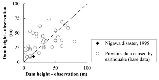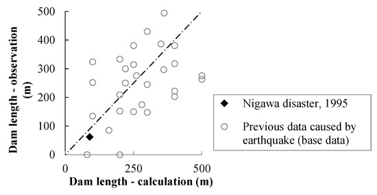 Next, we used Equations (1) and (2) to predict the deposition shapes of landslide dams caused by earthquake-induced embankment collapses that had not been previously analyzed, such as those in the Nigawa Yurino area (Table 1). Terrain and disaster data were retrieved from the literature [27,28,29] and the Nigawa Yurino area landslide museum (Table 2). Constructed embankments we viewed as components of the mountainsides. Constructed embankments were viewed as components of the mountainsides. The reproducibilities of the predictive formulae under such conditions (Table 2) are shown in Figure 9; the predicted and observed deposition lengths and heights in the Nigawa Yurino area were closely correlated (◆); the model was valid.