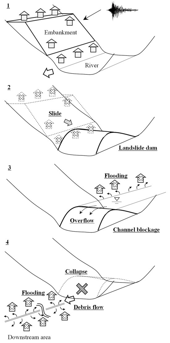 Figure 14 presents an overview of the disaster risk associated with river channel blockages triggered by the sliding collapse of embankments adjacent to rivers based on previous studies/reports. The following concerns are relevant: (1) direct damage to nearby residences when an earthquake triggers an embankment collapse; (2) landslide dam formation; (3) the inundation of upstream areas by accumulated water; and (4) flood and debris flow inundating downstream areas after landslide dams breach. However, these insights are based on past data; further exploration of, for example, topo-graphical conditions is desirable in the future.
