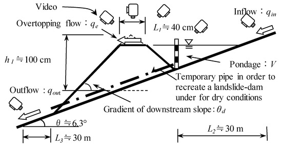Here, we present an analytical model, the reproducibility of which, in terms of predicting dam flood outflows, has been verified by reference to landslide dam breach experiments performed in real-world streams [54,55]. We verified model reproducibility for steep, but not gentle, landslide dams, that is, those forming after blockages of river channels with steep or gentle slopes (Figure 2 and Figure 3). For the latter, the deposition height is low compared to the deposition length [55].