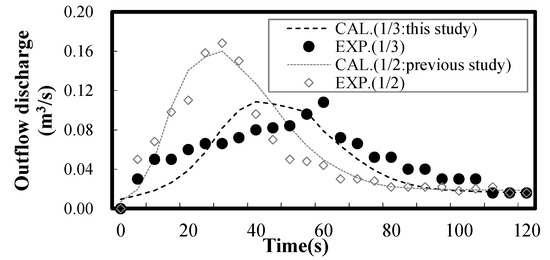 To verify the reproducibility of this analytical model for an overtopping breach (for example, Figure 17), the predicted and observed (actual) values of the dam flood outflows at the time of breach are shown in Figure 18, which includes an analysis of both gentle (dam slope gradient θd: 1/3) and steeper (dam slope gradient θd: 1/2) [45] slopes. As shown in Figure 18, although some errors in flood peak timing are apparent, the results are generally robust.