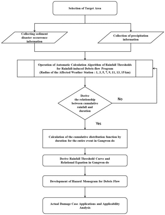 Ref. [29] develops slope-specific thresholds for dimensionless discharge and Shields stress to forecast debris flow initiation following wildfires. This work further presents a process-oriented approach for deriving rainfall intensity-duration thresholds, showcasing their consistency with empirical data. This synergy between process-based hydrologic models and empirical observations significantly advances the accuracy of debris flow warning systems. Ref. [30] presented the capability of a deep learning algorithm to determine the distribution of landslide rainfall thresholds in a potential large-scale landslide area and to assess the distribution of recurrence intervals using probability density functions, as well as to assist decision makers in early responses to landslides and reduce the risk of large-scale landslides. Ref. [31] analyzed Kalimpong town in the Darjeeling Himalayas, which is among the regions most affected by landslides, using the SIGMA model, and calculated threshold rainfall. Among domestic research cases, refs. [3,32] applied the Rainfall Triggering Index (RTI), which is the product of the preceding rainfall duration and intensity, to Korea, and proposed a debris-flow risk criteria using a probability density function. Ref. [33] proposed the risk criterion using quantile regression analysis based on the duration and the intensity of rainfall before the occurrence of a debris-flow disaster. To establish a Korean early warning system for a debris-flow disaster, a program-based automation algorithm is required, and an evaluation of the applicability of such an automation algorithm is deemed necessary.