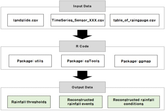 Rainfall standards that cause debris-flow disasters are mainly presented using the intensity–duration (I-D) method, which analyzes the relationship between rainfall intensity and duration, and various domestic and overseas studies have been conducted in this regard. In using the I-D method, selecting meteorological stations and the maximum allowed delay time between the end of the rainfall season and the occurrence of the debris-flow disaster are important input parameters that researchers may define differently. Ref. [22] proposed an automatic rainfall threshold calculation tool to predict debris flows applicable in southern Sicily, Italy, to address this issue objectively. In this study, the tool proposed by [12] was adapted and developed with the R language to suit the Korean terrain. Figure 1 shows the flowchart of this study, while Figure 2 shows the algorithm components of the rainfall threshold. In the input section, information on the occurrence of debris-flow disasters (debris-flow.csv), rain gauge stations (table_of_raingauge.csv), and rainfall time series (TimeSeries_Sensor.csv) are provided. The computation section comprises utils, a useful utility for programming and developing R packages; caTools for encoders, decoders, and classifiers; ggmap for spatial data visualization; and MASS for statistical functions. Finally, the output section provides reconstructed rainfall events affecting debris-flow disasters and the analysis results of reconstructed rainfall conditions and thresholds.