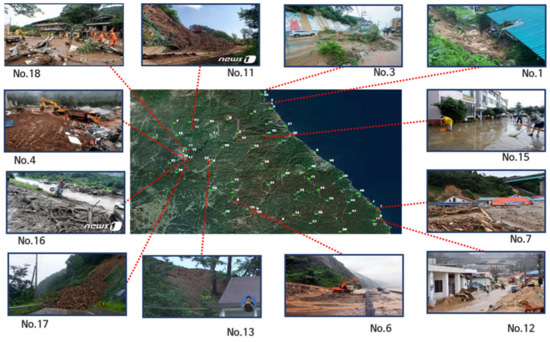 The area of Gangwon Province, characterized by its mountainous terrain which accounts for more than 80% of Korea’s frequent debris flow incidents, was selected as the focal region for this investigation. The geographical distribution of these debris flows is illustrated in the subsequent figure (Figure 4). Furthermore, an exhaustive literature review was conducted to amass a historical dataset of debris flow occurrences, with entries lacking precise locational and temporal data being systematically eliminated. As a result, the specific locations and times of occurrence for 18 debris flow events between 27 July 2011 and 5 August 2020 were compiled (Table 1). Additionally, rainfall data were sourced from the Korea Meteorological Administration (https://www.weather.go.kr). While the conventional methodology relied on the nearest rain gauge to establish a link between debris flows and rainfall, this study introduces an advanced methodology that automatically incorporates all viable gauges within a defined radius. This method applies weighting factors that account for both the spatial distance between the debris flow site and the gauge and hydrological attributes such as the volume of rainfall and the event’s duration, recognizing that a debris flow may be precipitated by multiple rainfall events. Moreover, the applicability of the proposed methodology was validated through its application to the 2019 debris-flow disaster in Gangwon-do, which tragically resulted in human casualties.