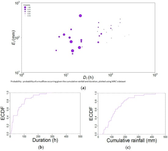 (a) Distribution of the DL (rainfall event duration) and EL (cumulated event rainfall) pairs, in log-log coordinates (purple dots); (b) ECDF (the empirical cumulative distribution function) of D (duration); (c) ECDF of E (cumulated rainfall) [35].