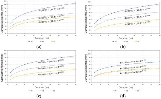 Table 3 details the parameters α and γ, along with the outcomes of the analysis on the relationship between cumulative rainfall and duration, contingent upon the maximum permissible distance from the influencing meteorological station. Table 4 summarizes the results of calculating cumulative rainfall and rainfall intensity according to the duration of each maximum allowed distance.