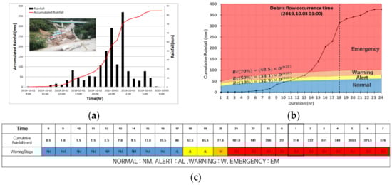 Increasing rainfall intensity due to climate change has raised the hazard of a debris-flow disaster in the vicinity of mountainous areas in Korea, resulting in higher risks to human lives and properties [1]. In particular, 43 people died from torrential rains caused by debris-flow disaster damage in Woomyeonsan in Seoul and Majeoksan in Chuncheon City in July 2011. In 2020, five deaths occurred in Gokseong-gun, Jeollanam-do. The damage caused loss of life and property, further emphasizing the social issue at hand. To address debris-flow disasters, establishing standards for early forecasting and alert issuance is essential. Preceding rainfall conditions, which influence soil stress and pore water pressure, are crucial factors that should be considered the direct cause of a debris-flow disaster [2,3,4,5].