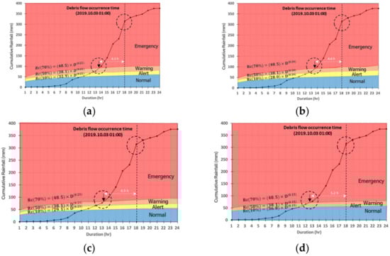 Results by maximum allowable distance ((a) maximum allowable distance 9 km: entered emergency stage about 4.3 h before the debris-flow disaster event occurred; (b) maximum allowable distance 11 km: entered emergency stage about 4.6 h before; (c) maximum allowable distance 13 km: entered emergency stage about 4.9 h before; and (d) maximum allowable distance 15 km: entered emergency stage about 5.2 h before).