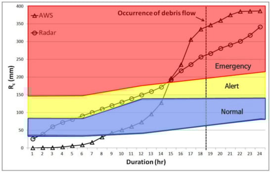 In [32], radar rainfall was used to estimate the rainfall of localized debris flows in mountainous areas, and a radar rainfall calibration model was developed using machine learning techniques. The basin average rainfall of the calibrated radar rainfall was calculated and applied to the same area as the subject of this study. The result of [32] showed a forecasting time of 3 h, as shown in Figure 10, but in this study, an average forecasting time of 4 to 5 h can be obtained.