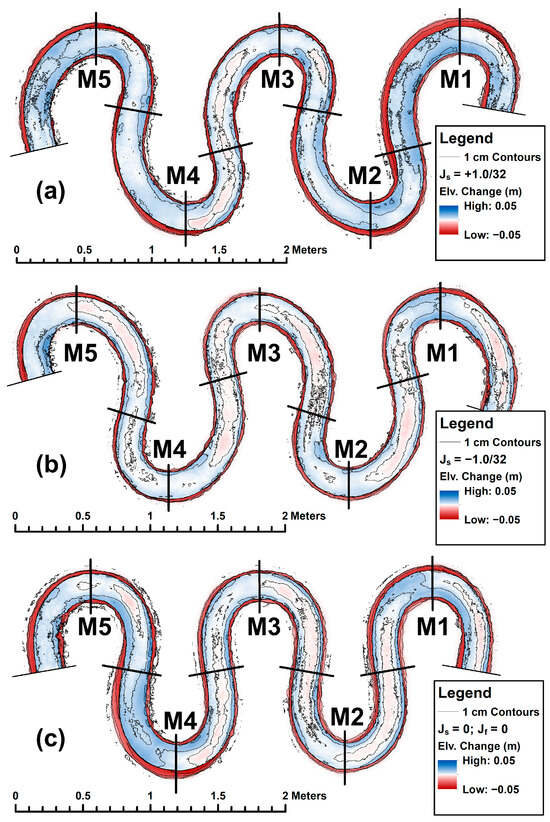 Rapid erosion in the first few minutes of each experiment matched with the observed morphological development, which also primarily occurred in the first 10 min of each experiment. Elevation differences between the initial and final topographies of each experiment are shown in Figure 2, with labels for each meander, from M1 through to M5. Meanders were defined to start at the upstream inflection point and end at the downstream inflection. Red areas correspond to regions of erosion, while blue areas indicate regions of net sediment deposition. The first meander (M1) of each experimental channel had more pronounced morphological development, especially in the up-valley skewed and non-skewed experiments. The increased development in M1 was attributed to inlet effects of flow accelerating through the straight inlet section, with effects diminishing in later meanders. Outlet effects were also noticeable, especially in the non-skewed experiment, but were considered to minimally affect the meandering region of interest and primarily only impacted the collected sediment data. Elevation differences showed erosion on both sides of the channel due to the initially vertical banks slumping into the channel. The slumping of the banks likely contributed to more rapid development in morphological features and a larger initial rate of sediment erosion.