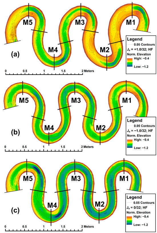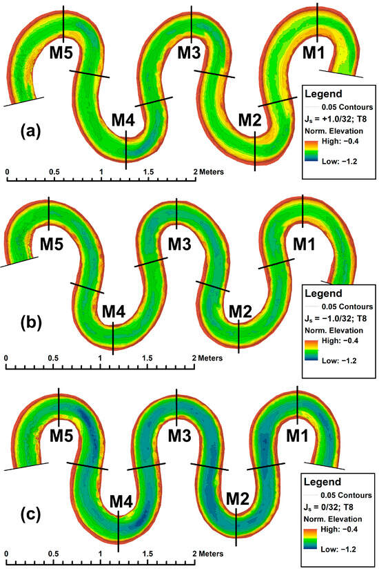 However, in their fixed bank flume, the pool did not form; instead, the deepest point in the channel bed was scouring at the outer bank. In these experiments, a pool formed instead, albeit at the same location. The down-valley skewed experiment also showed similar bar formation locations; however, they are harder to discern due to the lower magnitude of development. Once again, the deeper pool regions form in similar locations to the results of Abad and Garcia [20] upstream and downstream of the apex. However, one key difference was that the downstream pool location was not noticeably deeper than the upstream. In the non-skewed channel, the results were most comparable to the up-valley skewed experiment, where the bar formed upstream of the apex with a single corresponding pool.