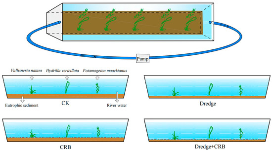 The response of eutrophic flowing or disturbed water to multiple restoration techniques has not been adequately studied. This study simulated hydrodynamic conditions and investigated the restoration effects of dredging and adsorbent inactivation, individually and in combination, on eutrophic water in a flowing-water environment. In addition, the enhancing effects of dredging and adsorbent inactivation followed by phytoremediation on the remediation effects, as well as the responses of submerged plant growth and phosphorus speciation to different remediation means, were studied. The P adsorbent used in most studies is lanthanum-modified bentonite (Phoslock®). Because lanthanum is a rare-earth element with scarce resources and potential biological toxicity [25,26], this study used calcium, which is widely available, eco-friendly, and can be effective in the removal of phosphorus [16,17], as a P removal material. However, the direct use of calcium-based compounds often causes large changes in water pH, and the dosing method also affects treatment longevity [27]. Our team recently prepared a calcium-loaded clay granular adsorbent (CRB), which could slowly release calcium-based compounds and had a good P adsorption effect in water with a pH ranging from 3 to 11 and did not cause sharp changes in water pH [28].