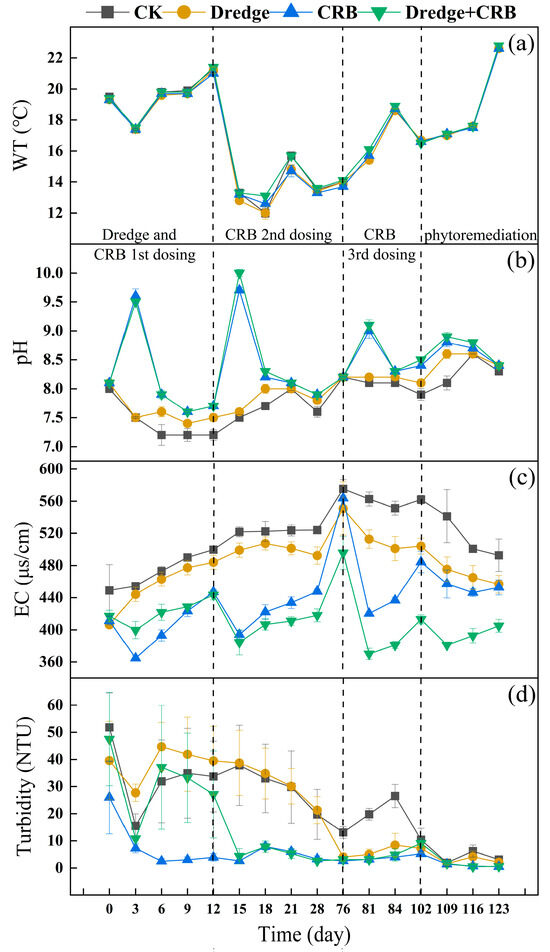 Changes in WT (a), pH (b), EC (c), and Turbidity (d) (means ± standard deviations) of the overlying water with time. Error bars indicate the standard deviations. CK: control group; Dredge: dredging treatment group; CRB: calcium-loaded clay granular inactivating treatment group; Dredge + CRB: combined dredging and CRB treatment group. WT: water temperature; EC: electrical conductivity. Three CRB dosages were performed after sampling on days 0, 12, and 76, and phytoremediation was performed after sampling on day 102.
