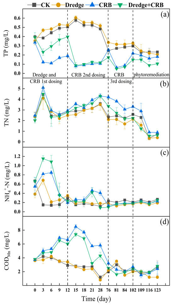 Changes in TP (a), TN (b), NH4+-N (c), and CODMn (d) contents (means ± standard deviations) of the overlying water with time. Error bars indicate the standard deviations. CK: control group; Dredge: dredging treatment group; CRB: calcium-loaded clay granular inactivating treatment group; Dredge + CRB: combined dredging and CRB treatment group. TP: total phosphorus; TN: total nitrogen; NH4+-N: ammonia nitrogen; CODMn: permanganate index. Three CRB dosages were performed after sampling on days 0, 12, and 76, and phytoremediation was performed after sampling on day 102.