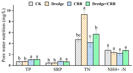 The TP and SRP contents in the pore water of the sediment were significantly higher in the CRB and Dredge + CRB groups than in the CK and Dredge groups. The TN content was significantly higher in the Dredge group than in the other three groups. The TN content in the Dredge + CRB group was significantly higher than that in the CRB group. There was no significant difference in the NH4+-N content among the groups (Figure 4).