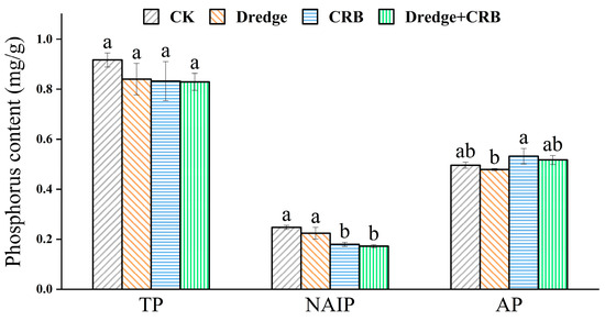The sediment TP content was lower in the Dredge, CRB, and Dredge + CRB groups compared to that in the CK group. There were no significant differences among the groups. The NAIP contents in the CRB group and Dredge + CRB group were significantly lower than the NAIP contents in the CK group and Dredge group, and the AP content in the CRB group was significantly higher than that in the Dredge group (Figure 5).