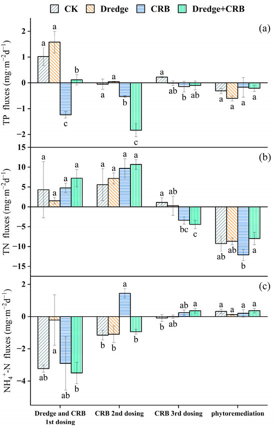 Sediment TP fluxes (a), TN fluxes (b), and NH4+-N fluxes (c) at the end of the experiment (means ± standard deviations). Different lowercase letters above the bars in the same section indicate significant differences among experimental groups (p < 0.05). Error bars indicate the standard deviations. CK: control group; Dredge: dredging treatment group; CRB: calcium-loaded clay granular inactivating treatment group; Dredge + CRB: combined dredging and CRB treatment group; TP: total phosphorus; TN: total nitrogen; NH4+-N: ammonia nitrogen.