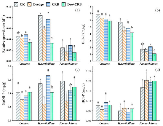 Relative growth rate (a), H2O-P (b), NaOH-P (c), and HCl-P (d) contents of the three submerged plants at the end of the experiment (means ± standard deviations). Different lowercase letters above the bars in the same section indicate significant differences among experimental groups (p < 0.05). Error bars indicate the standard deviations. CK: control group; Dredge: dredging treatment group; CRB: calcium-loaded clay granular inactivating treatment group; Dredge + CRB: combined dredging and CRB treatment group; H2O-P: water-soluble phosphorus; NaOH-P: organic phosphorus; HCl-P: calcium-bound phosphorus.