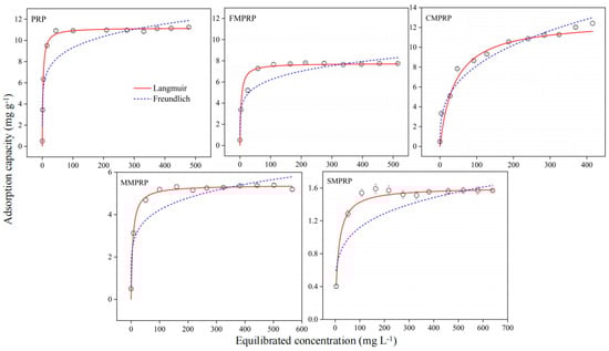The Cd2+ adsorption capacities of the MPRPs were calculated through nonlinear fitting of the PFO model and PSO model (Table 3, Figure 4). Compared with the two models, the correlation coefficient (R2) of the PSO model was the best, and the calculated Cd2+ adsorption capacity was in good agreement with the measured value. Therefore, the adsorption process of Cd2+ with the MPRPs was suitable to be described by PSO model, which also showed a chemical adsorption-based adsorption process. Moreover, according to the hypothesis of the PSO model, chemical adsorption may limit the rate of valence force through electron exchange or sharing between the MPRPs and Cd2+ [51]. When the initial concentration of Cd2+ was 40 mg L−1, it could be observed in the fitting parameters of the PSO model that the Cd2+ adsorption capacities of FMPRP, CMPRP, and MMPRP were 1.05, 1.88, and 0.95 mg g−1, being 15.38%, 106.59%, and 4.40% higher than that of PRP (0.91 mg g−1), respectively. However, the adsorption capacity of SMPRP for Cd2+ was only 0.54 mg g−1, which was 40.66% lower than that of PRP.