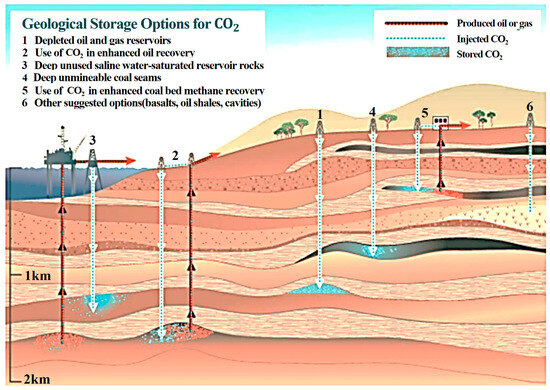 Illustration of different methods for geological CO2 sequestration [39,40,41,42].