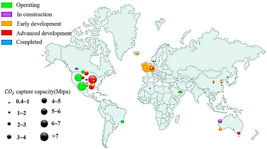 Global commercial-scale integrated carbon capture and storage (CCS) projects are shown in Figure 3. A first challenge of geological storage of carbon dioxide is to select and optimize favorable areas for carbon dioxide storage [43]. The selection and optimization of areas for geological storage of CO2 requires assessment of reservoir conditions, capping conditions, and safety [44,45,46,47,48]. The safety of geological carbon storage has long been a major concern and is largely influenced by several key factors, including injection pressure and the heterogeneity of fractures and caprocks [49,50]. In order to ensure long-term CO2 sequestration, a sufficiently large basin and a caprock with good sealing capacity are necessary [51].