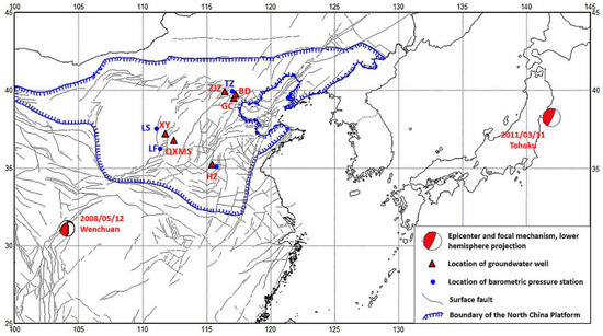 Distribution of the North China Platform outline (outlined in blue), underground fluid monitoring stations (red triangles), barometric stations (blue dots), and epicenter locations of major earthquakes (sand balls) [58].
