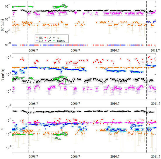 The vertical hydraulic conductivity coefficient (referred to as K’) of the aquitard, along with the storage coefficient (S) and transmissivity (T) of the aquifer, were continuously monitored from 2008 to 2011. The vertical dashed lines mark the occurrence of two major seismic events: the 2008 Wenchuan earthquake (MW 7.9) and the 2011 Tohoku earthquake (MW 9.1) [58]. The acronyms correspond to the wells located in Figure 5.