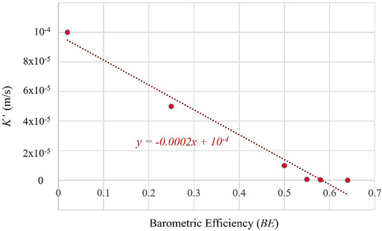 Relationship between the barometric efficiency (BE) and the vertical hydraulic conductivity coefficient K’ of the aquitard.